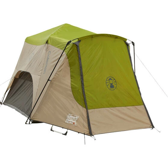 Get set for an epic family adventure with the Excursion Instant Up 4 Person Tent from Coleman! With enough space to fit four people within a one room design, round up your family or friends and head off to the campground. The Excursion Instant Up Tent features instant technology for a set up within minutes – allowing you more time to enjoy the outdoors. The front vestibule and awning add some shade and gear storage.